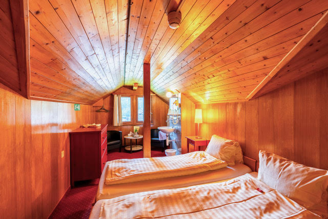Mountain and village views, no balcony. One double room (two single beds pushed together) with private bathroom (sink, shower, WC) with connecting door to another double room (two single beds pushed together, sink only).