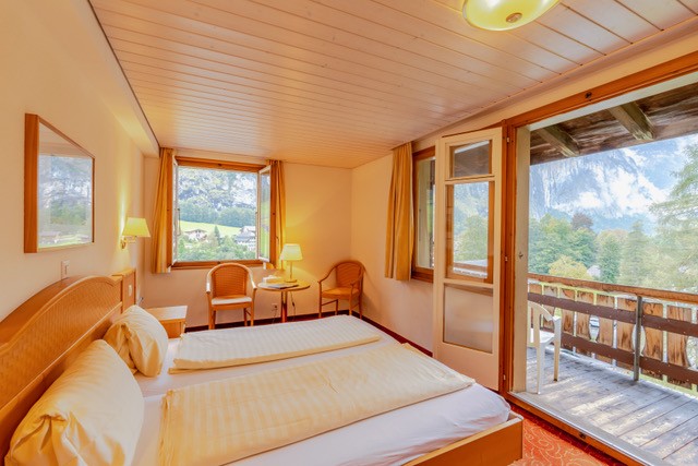 180º panoramic valley and waterfall view, with balcony. Two single beds pushed together, private bathroom (sink, shower, WC).