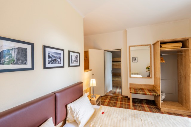 180º panoramic valley and waterfall view, with balcony. One double room (two single beds pushed together) with private bathroom (sink, shower, WC) with connecting door to another double room (adult size bunk beds, sink only).