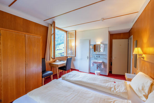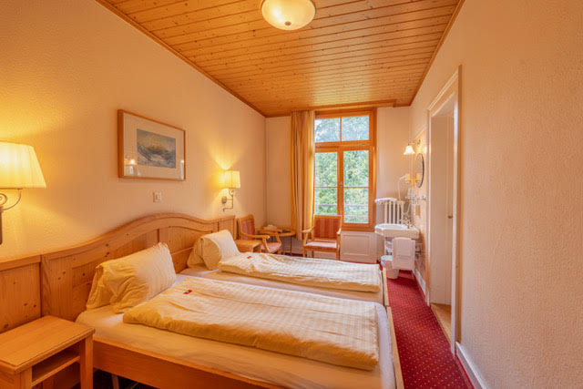Mountain and village views, no balcony. One double room (two single beds pushed together) with private bathroom (sink, shower, WC) with connecting door to another double room (two single beds pushed together, sink only).